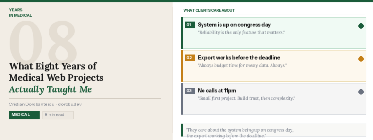 Medical clients don't care about clever architecture. They care about the system being up on congress day, the export working…